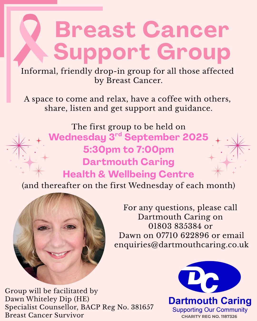 Dartmouth Caring will be hosting a new support group for patients affected by Breast Cancer. First meeting to be held on Wednesday 3rd September from 5.30pm-7.00pm by Dawn Whiteley, Specialist Counsellor.